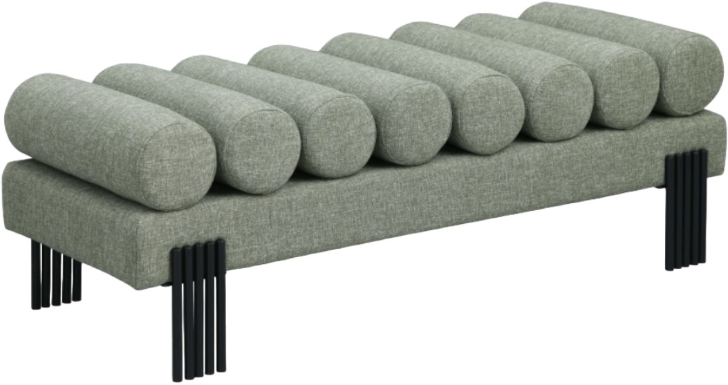 Revitalize your seating area with this stunning green Akeela linen textured fabric bench featuring a rolled cushion top. Upholstered in rich green linen textured fabric, this bench delivers both comfort and sophistication and features matte black metal legs to provide sturdy support while adding a modern touch to its art deco design.Read More