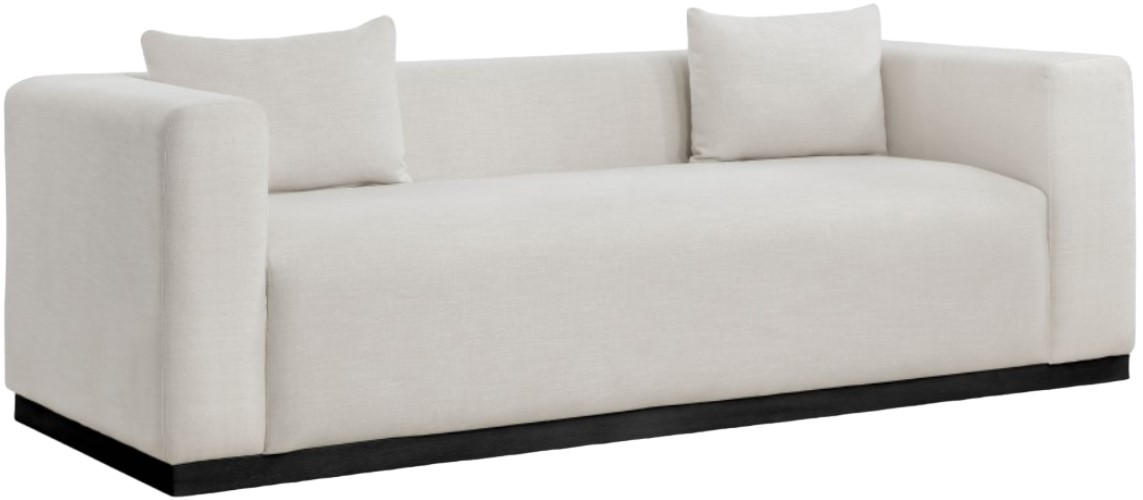 The sofa rests on a black finish solid wood base for stability and added contrast with its beige upholstery