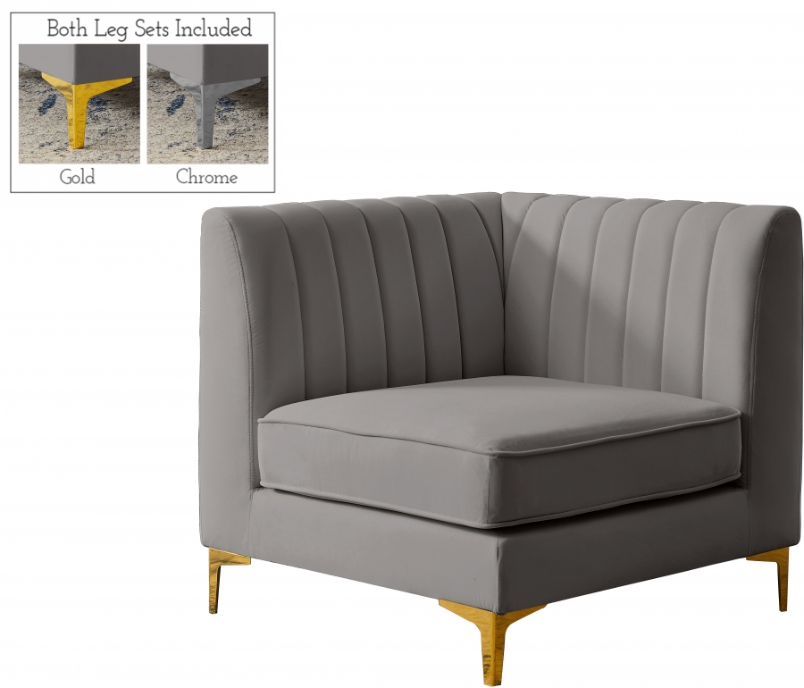 Elegant and eye-catching, the stunning grey velvet Alina Corner Chair from Meridian Furniture is the perfect addition to any space. Corner chair adds a contemporary style to any room.