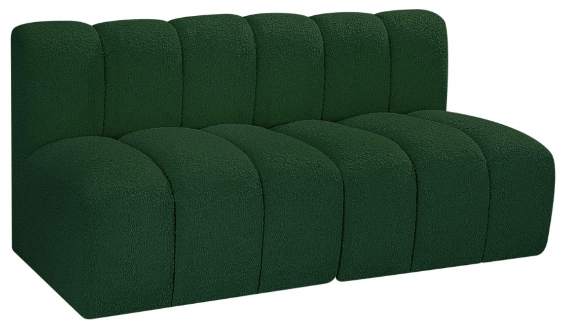 Give your living room or den the perfect blend of style and versatility with this Arc boucle fabric curved modular sofa. Part of the Arc modular furniture collection, this sofa comes upholstered in rich green boucle fabric and features deep channel tufting that adds a touch of luxury while enhancing comfort and support.Read More