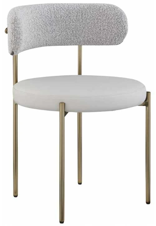 Give your dining room a modern boost with this Beacon vegan leather and boucle fabric dining chair. This pretty chair has the contemporary design elements you're looking for, from its curvy back to its thickly padded seat and brushed brass-finished metal frame. Taupe vegan leather provides the look of the real thing without the maintenance requirements.Read More