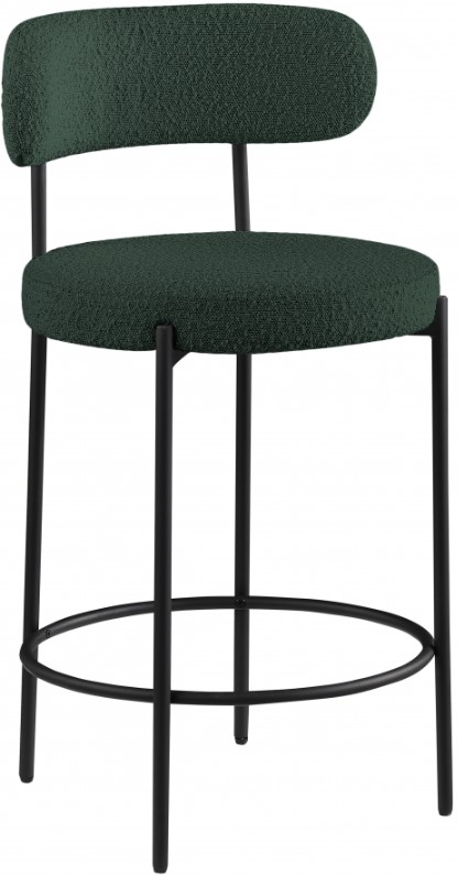 The curved backs support the body while you sip a frosty cold one or nosh on some breakfast fare. A matte black metal frame gives the stools' design durability while the green boucle fabric adds a touch of softness and comfort.