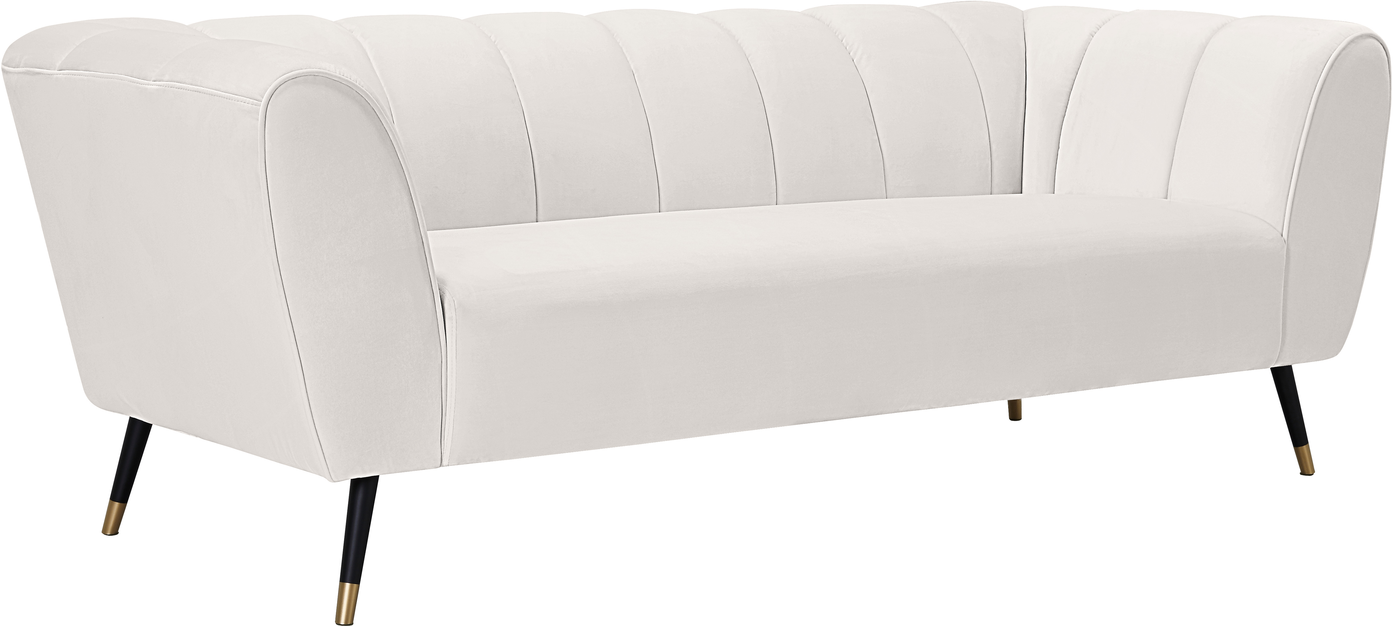 Sink your body into the inviting comfort of this Beaumont velvet sofa. Upholstered in a soft shade of cream with black metal legs tipped in gold, this chair oozes modern charm and up-to-the-minute comfort. The heavily stuffed arms, seat and back are bound to beckon at day’s end for you to sit and relax.Read More