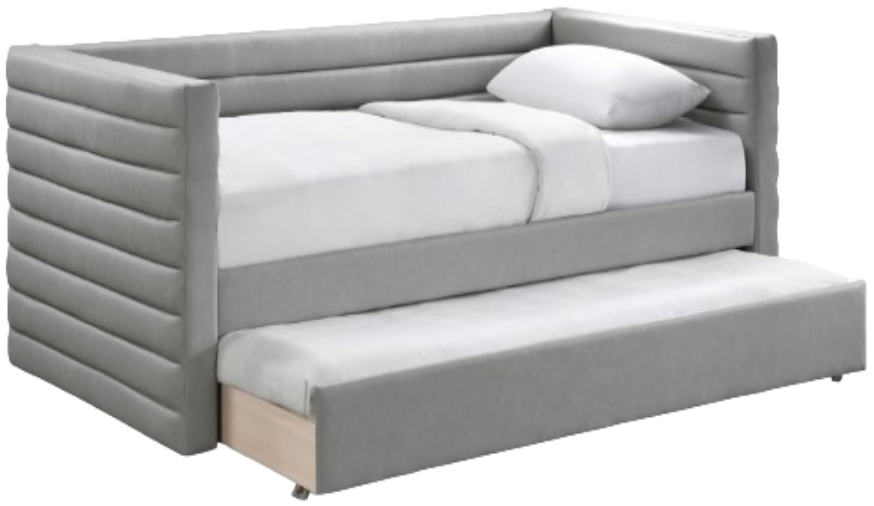Enjoy added sleeping space with the addition of this Beverly grey vegan leather twin daybed. It's upholstered with soft premium vegan leather, it's water-resistant and anti-scratch. Featuring deep channel tufting for comfort and style, the daybed includes a twin trundle with a rolling design for up to an 8" thick mattress.Read More