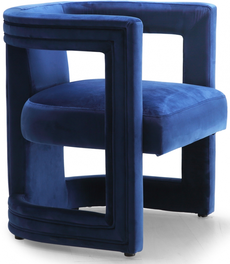 Make sitting a contemporary affair with this fun Blair navy velvet accent chair. A barrel design with a modish cutout twist makes this chair the center of attention wherever you use it. The frame is built from sturdy material for lasting beauty and performance, and the cushions are thick and plump, so they cradle your body while you unwind and rest. The chair is covered from top to base in rich navy velvet, so it feels amazingly soft to the touch.