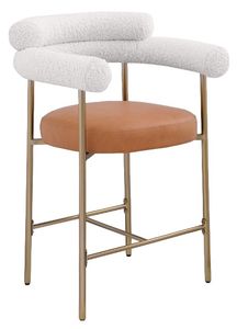 The brushed brass iron metal frame provides reliable support for this counter height stool while the rich cream boucle fabric upholstery and soft cognac vegan leather padding ensure comfort for all who decide to take a meal (or have a snack) with you.