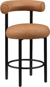 The upholstery is soft cognac vegan leather, so you have minimal worries about maintenance and upkeep. An iron metal frame with a black matte finish gives a contemporary look to this handsome stool.