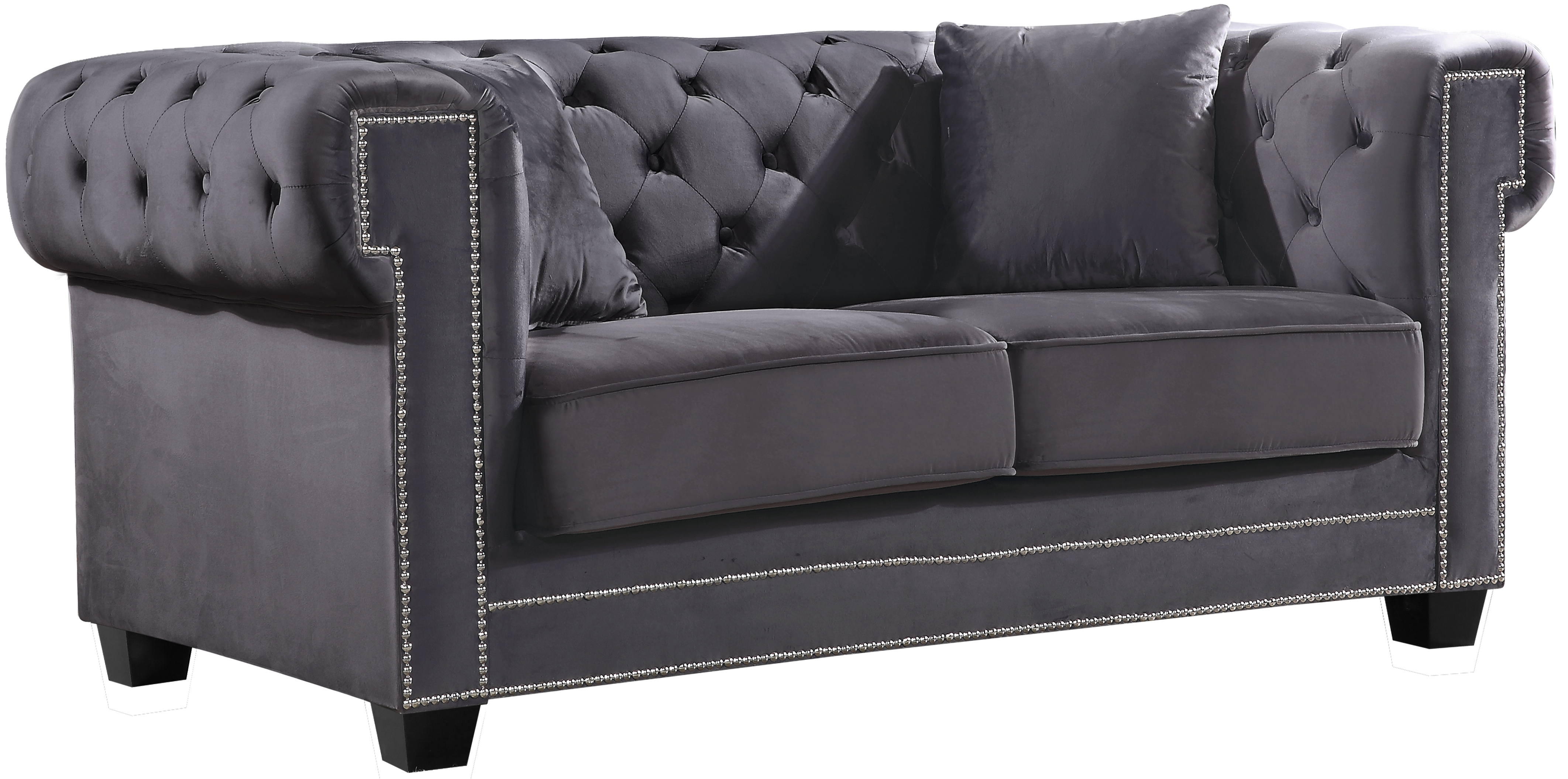The Bowery Collection by Meridian Furniture. Features beautifully designed tufted velvet upholstery with custom wood legs and a nail head trim. This collection is guaranteed to be the highlight of any home. Throw pillows included.Read More