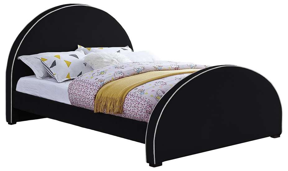 Its soft black velvet bed frame features cream velvet piping, giving it an appearance reminiscent of gingerbread. Dark espresso wood legs complement the black-and-cream frame while providing sturdy support. Its contemporary design is perfect for any modern bedroom space, and its velvety texture ensures you get plenty of Z’s.