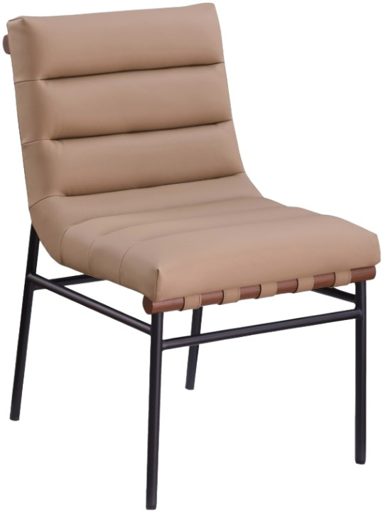 Every guest feels like a VIP when they're seated in this Burke tan vegan leather dining chair. A tufted back adds textural appeal and soft, posh comfort to every meal while walnut wood veneer metal dowels lend this chair a rustic touch.Read More