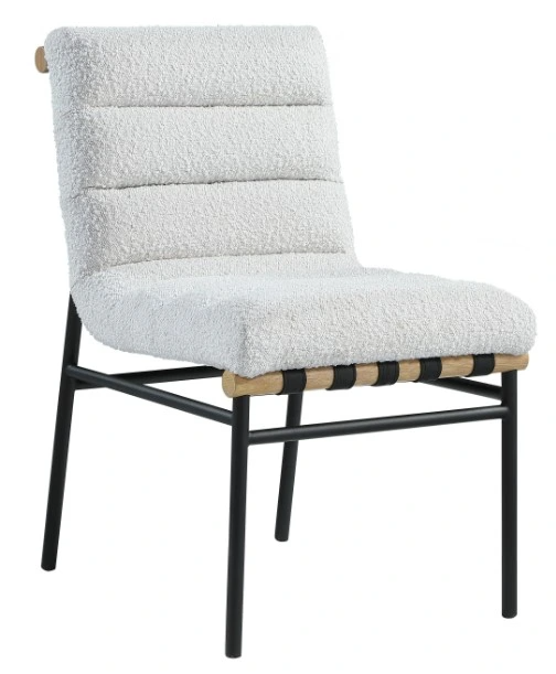 Keep guests sitting pretty for the entire meal with this Burke cream boucle fabric dining chair. This chair has rolled tufting for amazing support and durability, and features an armless design that facilitates conversation between diners. A white oak veneer metal dowel on the back of the chair and under the seat lends.Read More