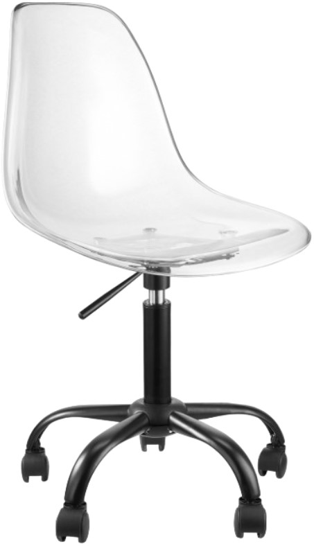 The seat and back of the chair are made from lucite polycarbonate for a modern look that's accentuated even more by the chair's black metal frame. The seat swivels for ease of movement, and its on a five star rolling base with casters, so you can roll to the file cabinet or fax machine without getting up. Adjust the seat easily with just a touch of the lever below.