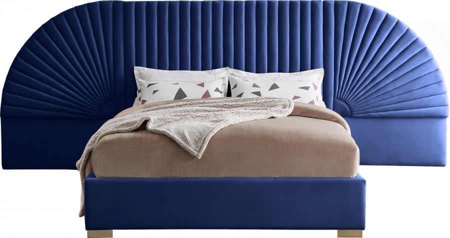 Enjoy sweet dreams in this beautiful Cleo velvet king size bed. The tall, luxurious velvet headboard is upholstered in a channel-tufted style, flanked by removable fan-shaped side pieces. The footboard and rails are comfortably upholstered in soft velvet as well, with gold steel legs supporting the frame.Read More