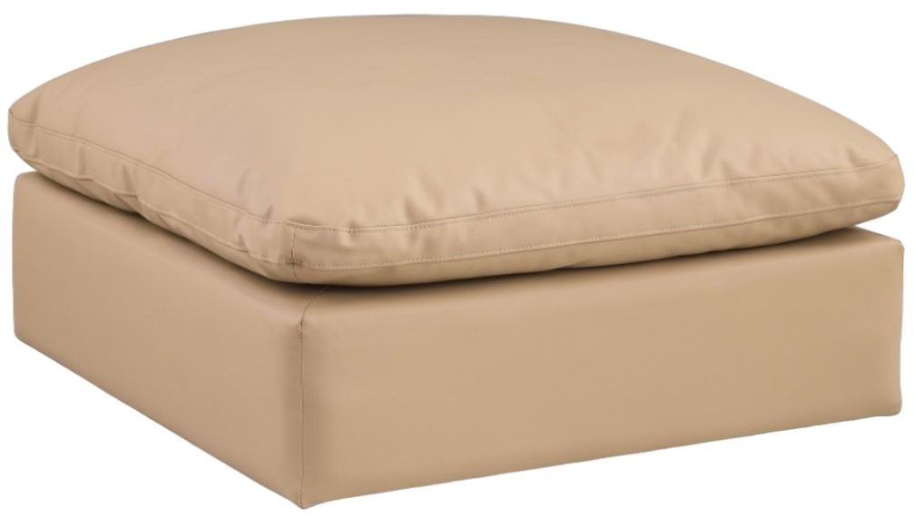 Wrapped in rich tan durable vegan leathered upholstery, this ottoman offers a plush embrace of overstuffed down feather cushions, carefully crafted to deliver the highest level of comfort. The perfect seat for creating an oasis for relaxation, this ottoman has thick foam surrounding its frame for added support and coziness.