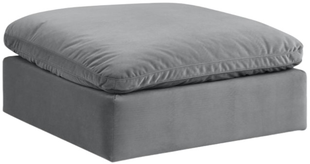 Wrapped in rich grey durable velvet upholstery, this ottoman offers a plush embrace of overstuffed down feather cushions, carefully crafted to deliver the highest level of comfort. The perfect seat for creating an oasis for relaxation, this ottoman has thick foam surrounding its frame for added support and coziness.