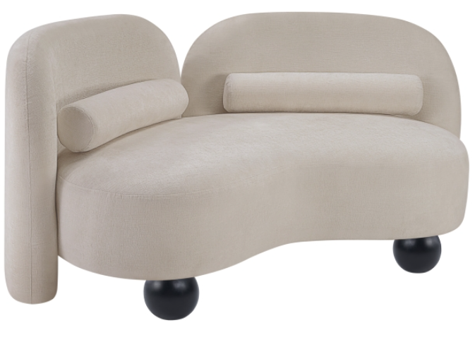 A cloud-like oasis of comfort, the Daphne beige chenille loveseat is a modern sensation. Its plush upholstery invites you to sink in and relax, while the curved design offers both support and opulence. The loveseat unique silhouette is complemented by a choice of black or natural wooden legs.Read More