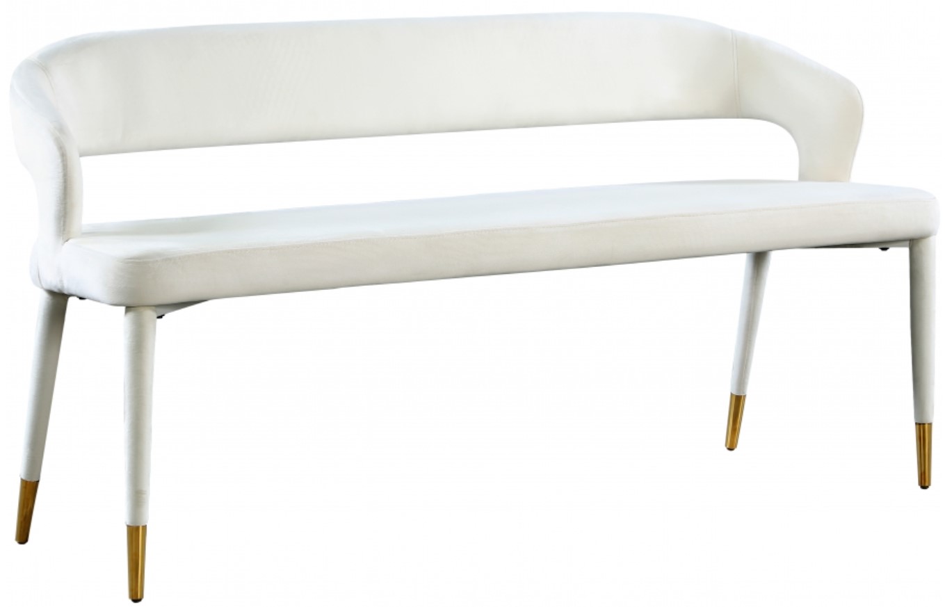 A rounded, open back provides additional comfort as well as style. Gold-tipped upholstered legs give this bench an extra touch of style that complements any contemporary living space. Its long length guarantees that you'll always have extra space to seat family and friends who visit.