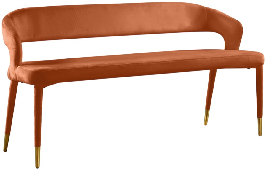 Enjoy extra seating space in your home with this Destiny cognac velvet bench. Its soft, cognac velvet upholstery offers coziness while sitting, ensuring you and your guests are always comfortable. A rounded, open back provides additional comfort as well as style.Read More