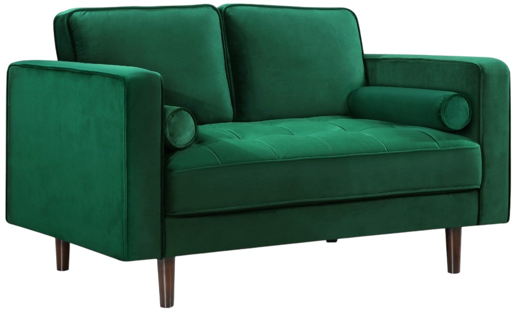 Featuring jewel-tone green velvet upholstery and tufted cushioning, this loveseat combines plush comfort with elegant flair. Wooden legs provide solid support and the two included roll pillows add relaxed style. The wide, inviting seat invites cozy lounging while the rich color transforms your living space into a refined statement of taste.Read More