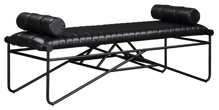 Elevate your space effortlessly with this Gatsby Black Vegan Leather Bench. Swathed in soft black faux leather and anchored by a matte black iron metal frame, it boasts a contemporary design that's both sleek and stylish. The included rolled pillows give this bench an upscale yet comfortable look.Read More