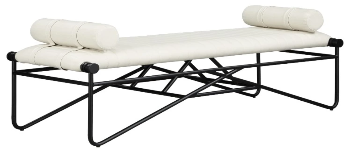 Elevate your space effortlessly with this Gatsby Cream Vegan Leather Bench. Swathed in soft black faux leather and anchored by a matte black iron metal frame, it boasts a contemporary design that's both sleek and stylish. The included rolled pillows give this bench an upscale yet comfortable look.Read More