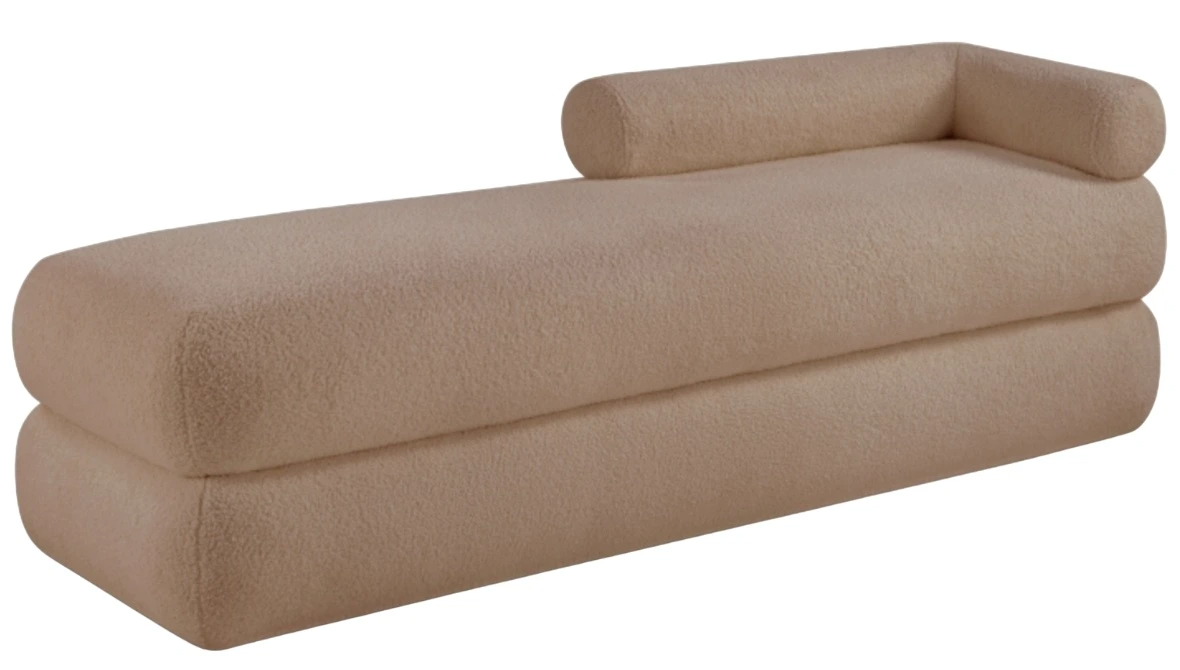 Cozy never looked so good as when you're curled up on this Kennedy beige faux shearling teddy fabric bench. The posh teddy fabric is ultra soft and welcoming, inviting you to lounge around and take it easy for a moment. A unique shape makes this bench an eye-grabbing addition to your living room or bedroom, with its channel base giving it added textural appeal.Read More