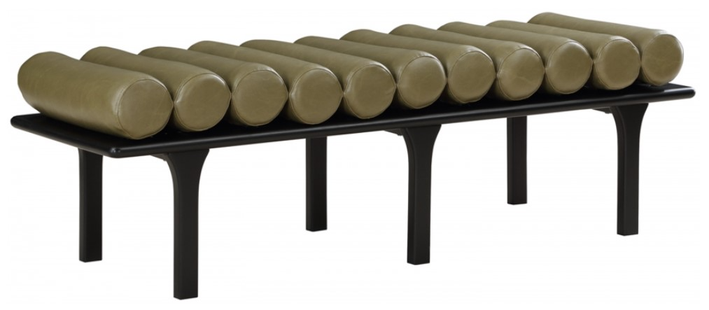 Outfit your foyer, bedroom, dressing room or other area of the home with this handsome olive Landon vegan leather bench. A rolled vegan leather seat upholstered in olive vegan leather gives this uniquely designed bench the luxe look of leather without the maintenance requirements.Read More