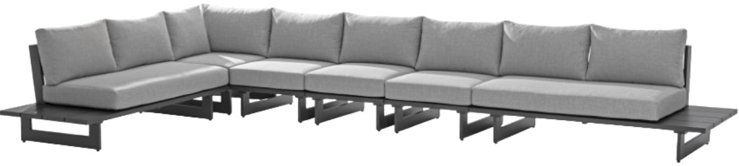 This modular sectional has grey water resistant fabric with a base made from grey aluminum, so it's sturdy, tough, and ready to face the elements with impeccable beauty, season in and season out. Shop the contemporary pieces in this collection to create the outdoor entertaining area of your dreams.