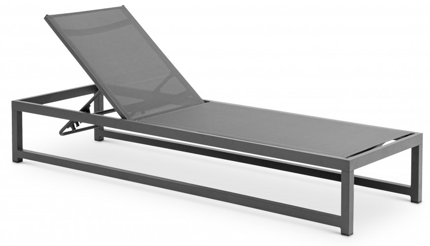 A grey mesh water resistant fabric supports you comfortably while you rest and relax under the sun, while adding a definitive resort appeal.