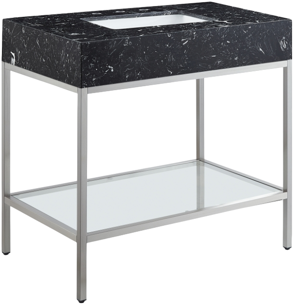 Give your bathroom a fresh new look with this Marmo 36-inch bathroom vanity. This eye-grabbing vanity gives your restroom a spa vibe that's oozing contemporary charm and sophistication. The black marble sink features white veining for an upscale presentation and rests on a brushed chrome-finish stainless steel base for long-lasting beauty and performance.Read More