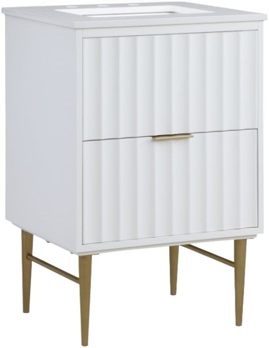 Give your bathroom a fresh new look with this Modernist bathroom vanity. This 24-inch vanity features a strikingly rich white finish for a clean, contemporary aesthetic. Brushed gold stainless steel legs and handles add to its robust appearance, and a quartz top adds to its resilient beauty.Read More