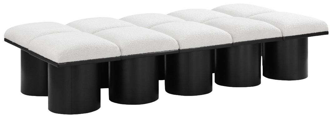 Bring valuable seating and remarkable style to your space with this cream Pavilion Boucle Fabric Bench, an exquisite balance of style and usability for the entryway, bedroom, and beyond. Crafted from oak veneer with a black finish, this bench has a 4-inch-thick seat cushion that's channel-tufted for a touch of luxury.Read More