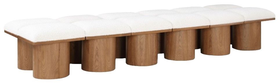 Bring valuable seating and remarkable style to your space with this cream Pavilion Boucle Fabric Bench, an exquisite balance of style and usability for the entryway, bedroom, and beyond. Crafted from oak veneer with a walnut brown finish, this bench has a 4-inch-thick seat cushion that's channel-tufted for a touch of luxury.Read More
