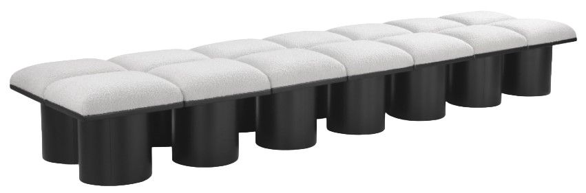 Bring valuable seating and remarkable style to your space with this cream Pavilion Boucle Fabric Bench, an exquisite balance of style and usability for the entryway, bedroom, and beyond. Crafted from oak veneer with a black finish, this bench has a 4-inch-thick seat cushion that's channel-tufted for a touch of luxury.Read More