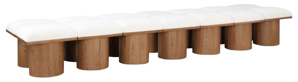 Bring valuable seating and remarkable style to your space with this cream Pavilion Boucle Fabric Bench, an exquisite balance of style and usability for the entryway, bedroom, and beyond. Crafted from oak veneer with a walnut brown finish, this bench has a 4-inch-thick seat cushion that's channel-tufted for a touch of luxury.Read More