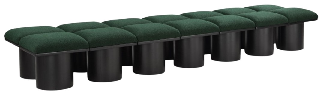 Bring valuable seating and remarkable style to your space with this green Pavilion Boucle Fabric Bench, an exquisite balance of style and usability for the entryway, bedroom, and beyond. Crafted from oak veneer with a black finish, this bench has 4-inch-thick seat cushion that's channel-tufted for a touch of luxury.Read More