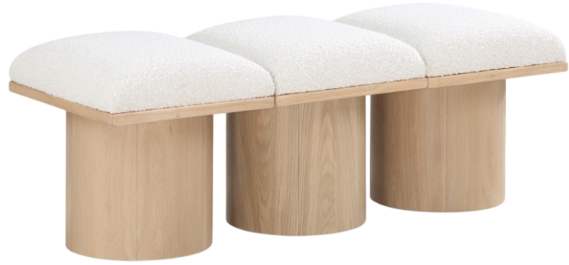 Bring valuable seating and remarkable style to your space with this cream Pavilion boucle fabric bench, an exquisite balance of style and usability for the entryway, bedroom, and beyond. Crafted from oak veneer with a natural finish, this bench has a 4-inch-thick seat cushion that's channel-tufted for a touch of luxury.Read More