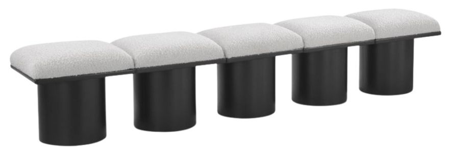 Bring valuable seating and remarkable style to your space with this cream Pavilion Boucle Fabric Bench, an exquisite balance of style and usability for the entryway, bedroom, and beyond. Crafted from oak veneer with a black finish, this bench has 4-inch-thick seat cushion that's channel-tufted for a touch of luxury.Read More