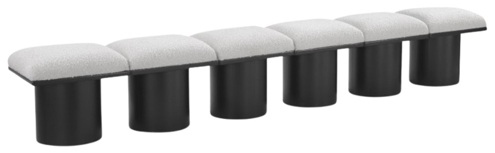 Bring valuable seating and remarkable style to your space with this cream Pavilion Boucle Fabric Bench, an exquisite balance of style and usability for the entryway, bedroom, and beyond. Crafted from oak veneer with a black finish, this bench has 4-inch-thick seat cushion that's channel-tufted for a touch of luxury.Read More