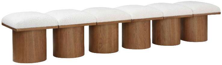 Bring valuable seating and remarkable style to your space with this cream Pavilion boucle fabric bench, an exquisite balance of style and usability for the entryway, bedroom, and beyond. Crafted from oak veneer with a walnut brown finish, this bench has a 4-inch-thick seat cushion that's channel-tufted for a touch of luxury.Read More