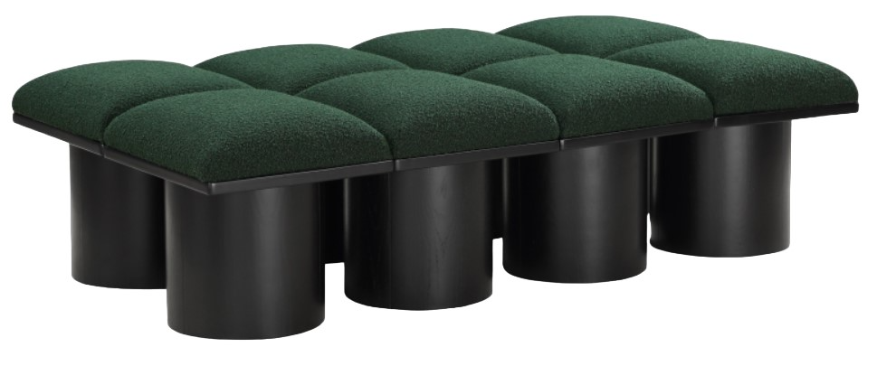 Bring valuable seating and remarkable style to your space with this green Pavilion Boucle Fabric Bench, an exquisite balance of style and usability for the entryway, bedroom, and beyond. Crafted from oak veneer with a black finish, this bench has a 4-inch-thick seat cushion that's channel-tufted for a touch of luxury.Read More