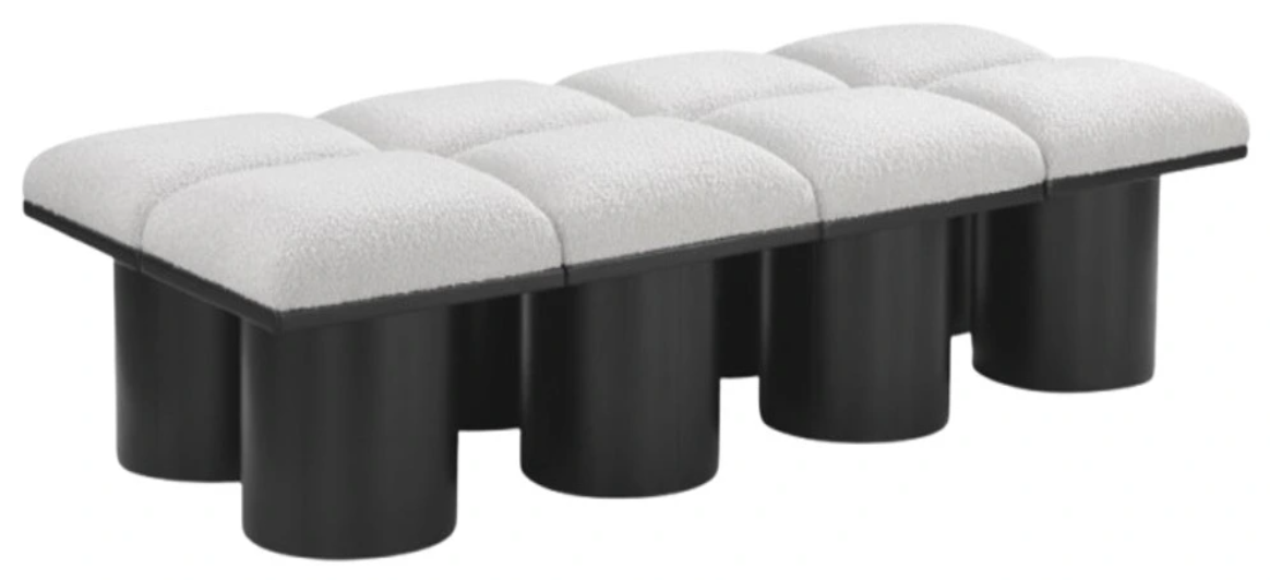 Bring valuable seating and remarkable style to your space with this cream Pavilion Boucle Fabric Bench, an exquisite balance of style and usability for the entryway, bedroom, and beyond. Crafted from oak veneer with a black finish, this bench has 4-inch-thick seat cushion that's channel-tufted for a touch of luxury.Read More