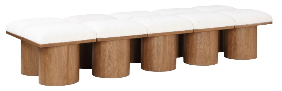 Bring valuable seating and remarkable style to your space with this cream Pavilion Boucle Fabric Bench, an exquisite balance of style and usability for the entryway, bedroom, and beyond. Crafted from oak veneer with a walnut brown finish, this bench has a 4-inch-thick seat cushion that's channel-tufted for a touch of luxury.Read More