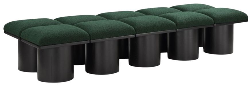 Bring valuable seating and remarkable style to your space with this green Pavilion Boucle Fabric Bench, an exquisite balance of style and usability for the entryway, bedroom, and beyond. Crafted from oak veneer with a black finish, this bench has 4-inch-thick seat cushion that's channel-tufted for a touch of luxury.Read More