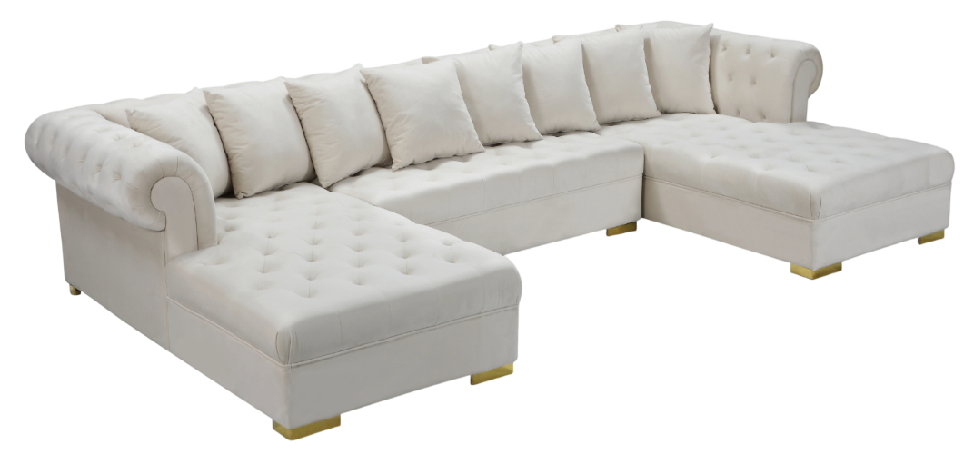 Get ready to relax after a long day with this Presley Cream Velvet 3pc. Sectional from Meridian Furniture. Featuring rich cream velvet upholstery with deep tufting and comfy pillows, this double chaise sectional provides a luxurious, cozy space to kick back and watch TV, take a nap, or curl up with a nice book.Read More