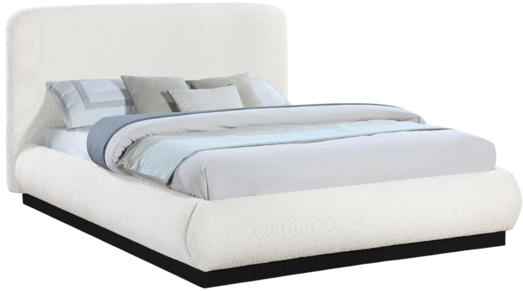 Give your bedroom (and yourself) the royal treatment with this Rigby cream boucle fabric queen bed. Wrapped in rich cream boucle fabric, its black finish fluted base exudes sophistication. Fully slatted, it eliminates the need for a box spring, offering modern convenience.Read More