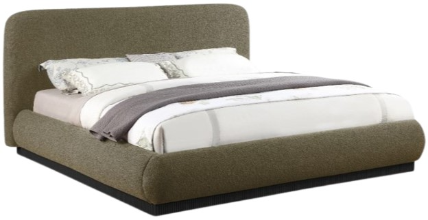 Give your bedroom (and yourself) the royal treatment with this Rigby olive boucle fabric king bed. Wrapped in rich olive green boucle fabric, its black finish fluted base exudes sophistication. Fully slatted, it eliminates the need for a box spring, offering modern convenience.Read More