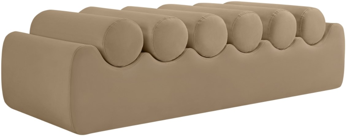Discover the Rumble tan vegan leather bench, featuring a sleek, soft feel that adds a touch of contemporary elegance to any room. This stylish bench offers six removable bolster pillow seats for enhanced comfort and versatility.Read More