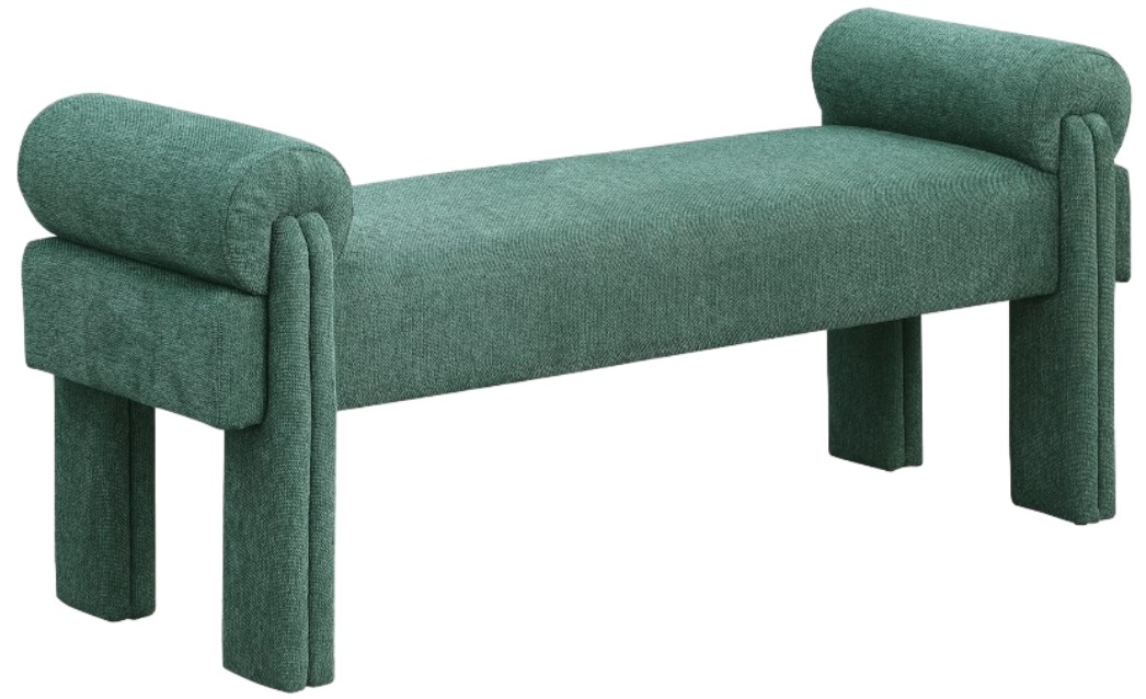 This lovely art deco seat has loads of room to sit while you pull on boots or take off shoes. The soft green polyester fabric is lovely to the touch, and the rounded arm pillows give it an extra inviting feel.