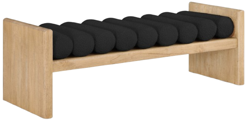 Add originality to your home with this unique bench from Meridian Furniture's Waverly collection. Crafted using solid rubber wood with a natural finish, this bench makes a bold statement in any living space. Its H-shaped design holds nine rich black boucle fabric cushion rolls on top, providing a comfortable place to sit for you or your guests.Read More